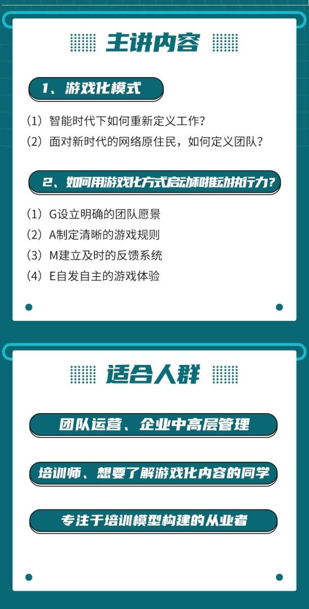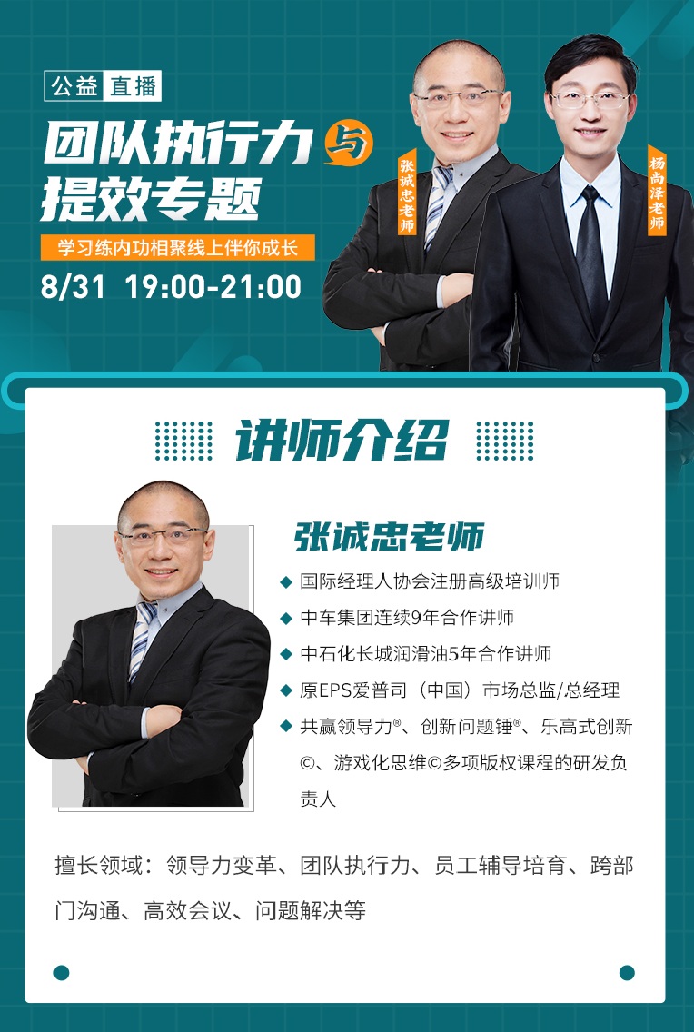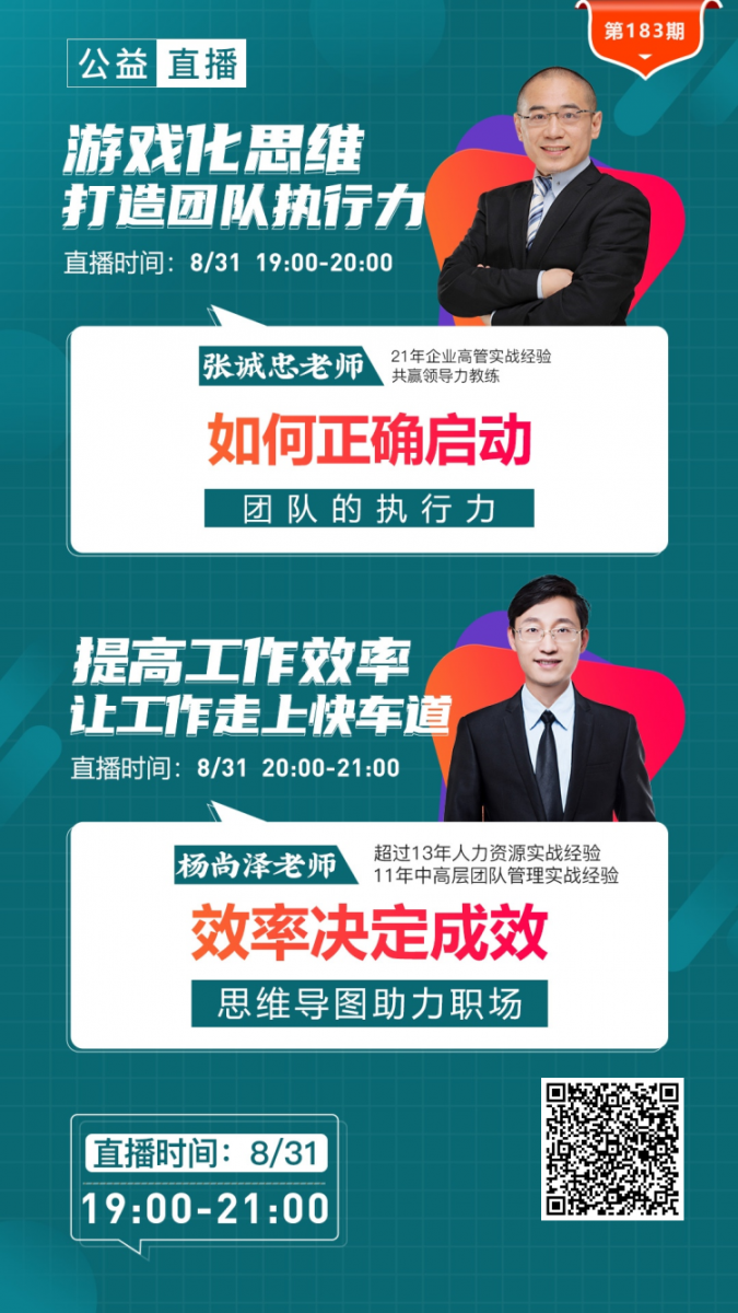 8月31日公益直播,19:00-21:00由21年企业高管实战经验共赢领导力教练张城忠老师分享《游戏化思维打造团队执行力》、由超过13年人力资源实战经验11年中高层团队管理实战经验杨尚泽老师分享《提高工作效率让工作走上快车道》。