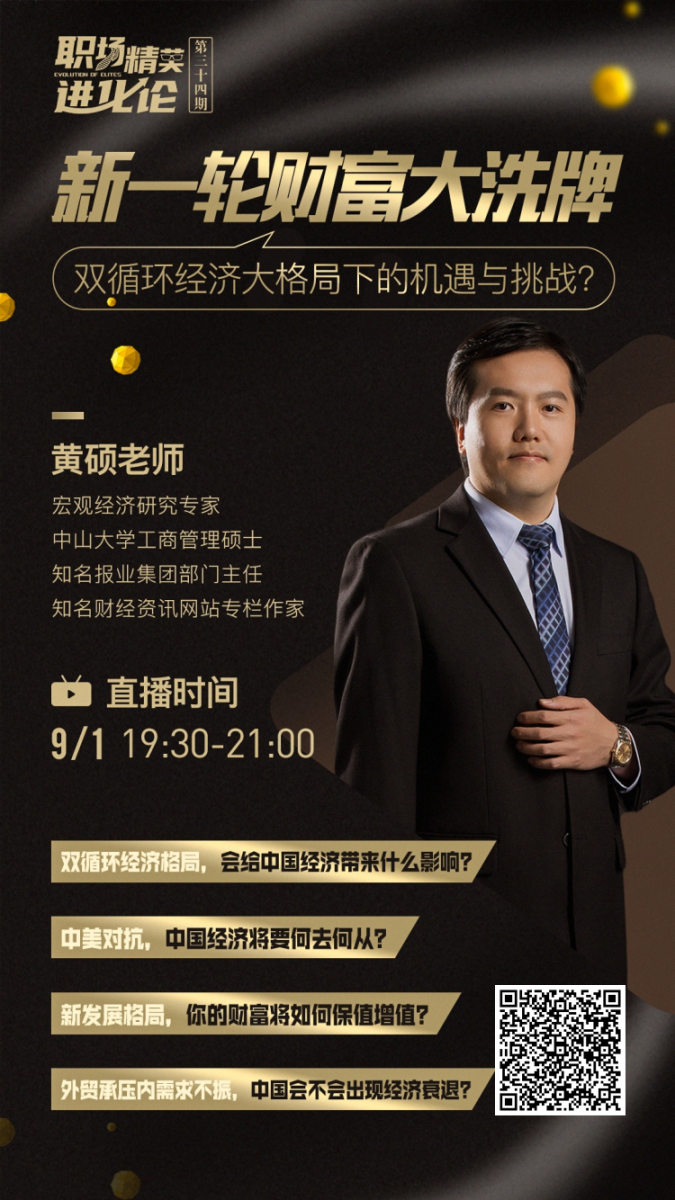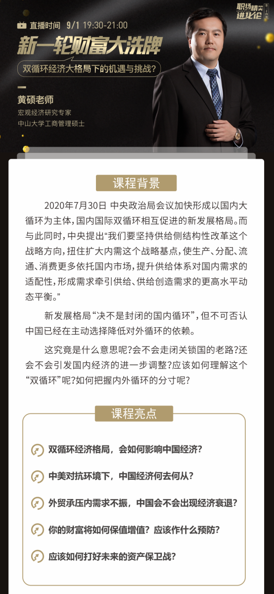 树立战略意识;理解当前行业环境;深刻理解国家经济政策;把握投资动向,深刻理解经济热点事件。9月1日,19:30-21:00【宏观经济研究专家】黄硕老师分享《新一轮财富大洗牌——双循环经济大格局下的机遇与挑战》【职场精英进化论】让你足不出户,尽享天下事。