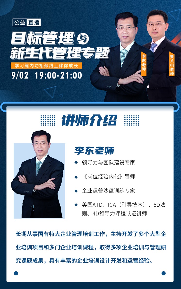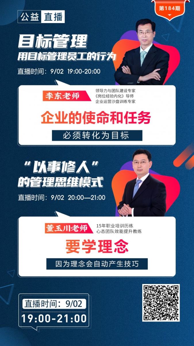 企业的使命和任务,必须转化为目标要学理念,因为理念会自动产生技巧9月2日公益直播19:00-20:00领导力与团队建设专家—李东老师:《游戏化思维——打造团队执行力》20:00-21:00心态团队效能提升专家—董玉川老师《“以事修人”的管理思维模式》。