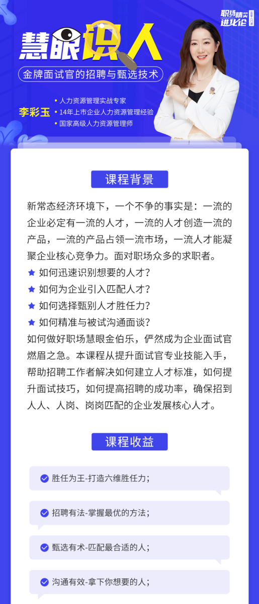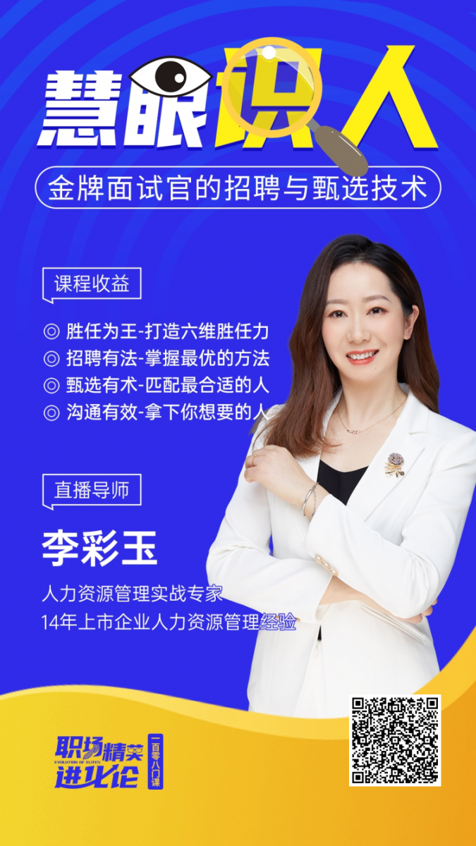 一流的企业必定有一流的人才,一流的人才创造一流的产品,一流的产品占领一流市场,一流人才能凝聚企业核心竞争力。如何招到一流的人才?4月22日19:30【职场精英进化论】直播间,李彩玉老师将从提升面试官专业技能入手,确保招到高匹配的企业发展核心人才。