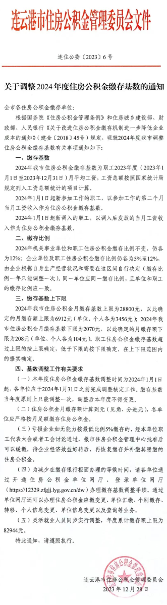关于江苏省连云港市调整2024年度住房公积金缴存基数的通知