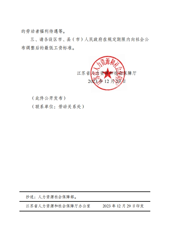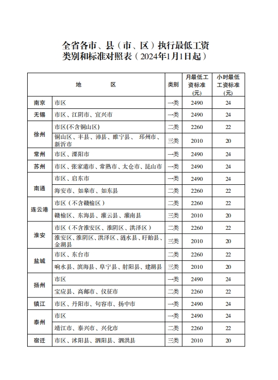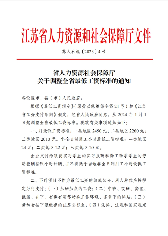 江苏省人力资源社会保障厅关于调整全省最低工资标准的最新通知2024年1月1日执行